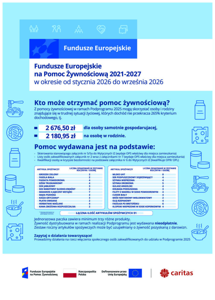 Caritas Diecezji Kieleckiej rozpoczyna kolejną edycję Fundusze Europejskie na Pomoc Żywnościową 2021 – 2027, Podprogram 2025 współfinansowany ze środków Europejskiego Funduszu Społecznego Plus.